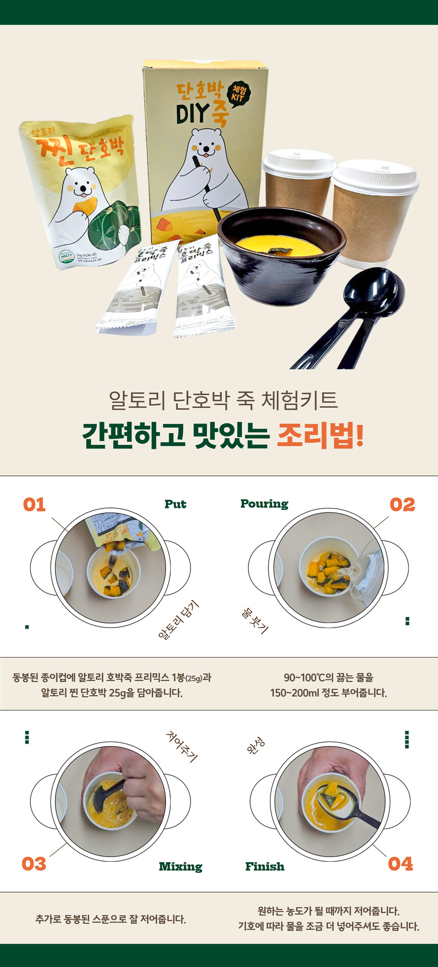 알토리 단호박죽 체험키트 (찐 단호박 50g + 프리믹스25g 2봉 + 종이컵 2개 + 스푼 2개) 간편 키트 스프 건강죽